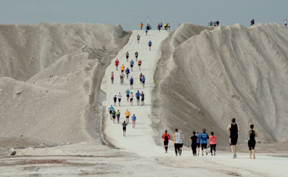 Einmal jährlich laden die Betreiber eines Kalibergwerks dazu ein, an einem Lauf über ihre Abraumhalde teilzunehmen. Ein weisser Pfad führt die neonfarbenen Gäste über die von Maschinen geformte Bergkulisse. Ihr Auftauchen ist so plötzlich wie ihr Verschwinden.